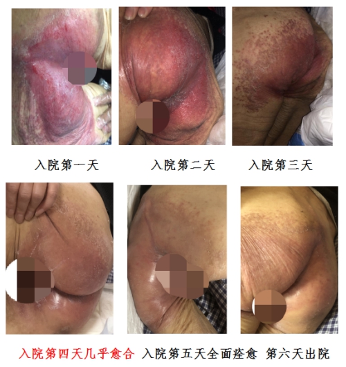 李林锋主任医师指示:积极治疗基础疾病,纠正心衰,加强营养的同时,做好皮肤护理工作,大限度减轻患者痛疼,并做好患者的心理工作。陈丽燕提出:一方面加强预防,稳定状态,一方面加强皮肤的局部治疗。根据失禁性皮炎预防护理原则:清洁、滋润及保护,护理团队给出了对症的疗法:①指导患者家属及时清理皮肤上的大小便,保持皮肤的清洁和干爽、透气,撤除尿不湿。最简单易取的是使用温水进行清洗,清洁时应该动作轻柔,避免用力擦导致皮肤损害,避免清洗过度等;②避免皮肤长期受到大小便刺激;③积极消除IAD的危险因素。如摩擦力和剪切力问题等。④采用食用麻油进行护肤。基于以上护理使用红霉素+食用麻油二合一的方法在失禁性皮炎中显奇功(常规一天三次,根据范围使用红霉素和麻油的混合液,始终保持患者处于油性状态):通过全体医护人员4天的努力,时常去安慰和帮扶她,患者皮肤迅速痊愈。