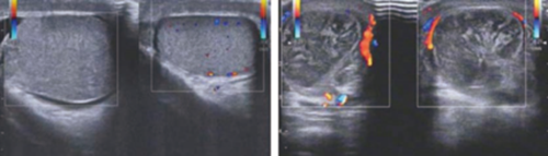 (二)急性睾丸、附睾炎:均属于睾丸急症,呈炎症表现,主要临床表现为疼痛、发热、寒战,彩色多普勒可见睾丸内彩色血流信号丰富,结合检验结果及临床表现可鉴别。