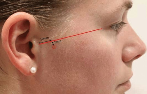 耳屏前方约1cm的位置(如上图)。我们用手从耳屏往前稍向下一点点的方向触摸,同时做张口闭口的动作,当你摸到一个可以活动的关节时,这个位置就是颞下颌关节,这个关节也是我们头面部唯一能活动的部分。