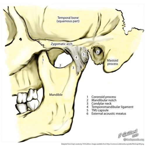 如上图:3.下颌骨髁突;4.颞下颌关节韧带;5.颞下颌关节关节囊;6.外耳道