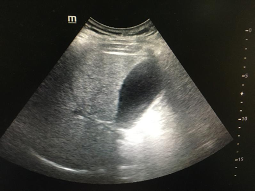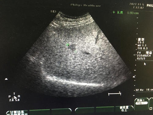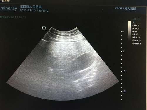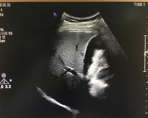 (2)重度脂肪肝:肝脏体积增大,形态饱满,肝回声均匀、细密、明显增强,肝内管道结构模糊不清,后方回声明显衰减,深面的膈肌显示不清。