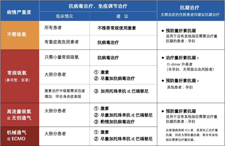 新冠病毒感染分为4型,包括轻型、中型、重型、危重型。对不需要住院及吸氧轻型、中型患者以对症治疗为主,不推荐常规加用糖皮质激素,有发展为重症/危重症危险的人群建议抗病毒治疗。由于新冠病毒感染主要病理生理学机制是发病后数天内的病毒增殖,以及此后7天左右引发的宿主免疫炎症反应。因此,在发病早期就要给予抗病毒药物或中和抗体药物,在发病7天以后中症或者重症的患者以抗炎治疗为主。