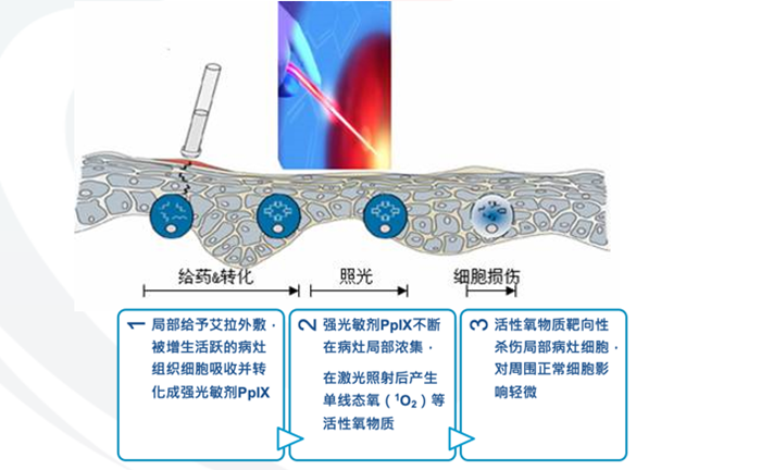 光动力疗法(PDT)是用光敏药物和激光活化治疗宫颈癌前病变、HPV感染、增生性皮肤疾病的一种新方法。病变部位外敷光敏药物后,用特定波长照射病灶部位,能使选择性聚集在病灶组织的光敏药物活化,引发光化学反应破坏病灶。新一代光动力疗法(PDT)中的光敏药物会将能量传递给周围的氧,生成活性很强的单态氧。单态氧能与附近的生物大分子发生氧化反应,产生细胞毒性进而杀伤病变细胞。与传统疗法相比,PDT的优势在于无创伤、保护女性生育功能,精确进行有效的治疗,这种疗法的副作用也较小。