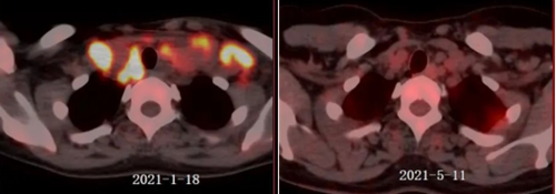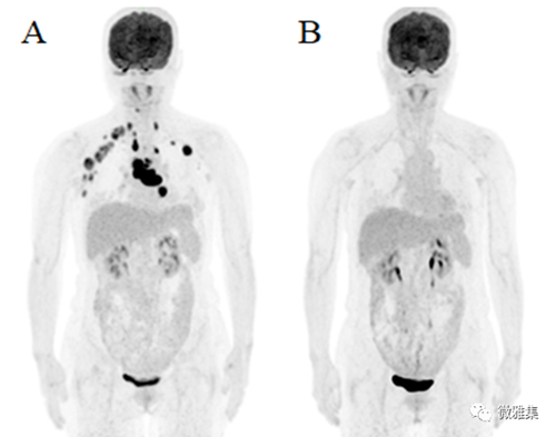 女,21岁,弥漫大B细胞淋巴瘤,A.治疗前PET全身MIP图,示双颈深、锁骨、腋窝及左肺门、纵隔多发肿大淋巴结,代谢增高(Ⅱ期);B.4程化疗后PET全身MIP图,原病灶消失,评价为完全缓解CR,Deauville score,DS(见表4)评分为1分