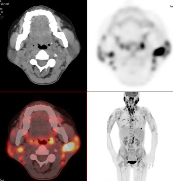 右侧扁桃体、左侧颈部及多处骨髓代谢增高灶(Ⅳ期)
