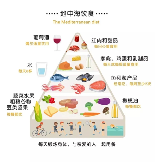 3、地中海饮食:以植物品类为主,包括全谷物类制品,橄榄油,水果,蔬菜,豆类,坚果类等。动物蛋白以鱼和海鲜为主,适量进食,小份为佳。脂肪的摄入建议以橄榄油代替常规食用油和黄油。多吃鱼,少吃红肉。多喝水,少喝饮料。