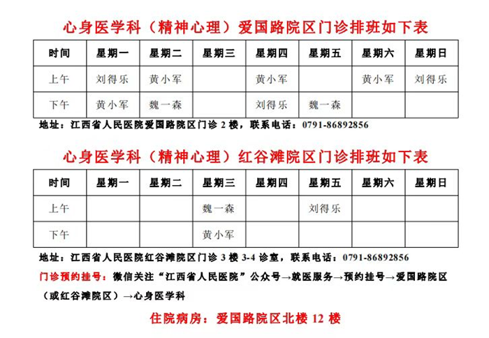 江西省人民医院心身医学科是集临床、教学、科研为一体的精神(心理)医学专科;是国家精神心理疾病临床医学研究中心(中南大学湘雅二医院)联盟成员单位;目前有医护17名,其中医生5名,其中有医学博士1名,硕士4名,中、高级职称医师2名。