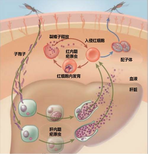 首先,感染疟疾后处于发病阶段的人以及体内携带疟原虫者都属于传染源,当蚊子叮咬了这些人的血,血中的疟原虫就被吸进蚊子体内,疟原虫在蚊子体内增殖和发育,约10-14天后发育成熟,如果这个阶段蚊子叮咬了一个健康人,疟原虫便通过血液循环迅速进入人体肝细胞内、红细胞内发育,而后肝细胞、红细胞破裂,大量代谢产物释放,引起典型寒战、发热、大汗的表现。当疟原虫再次进入正常红细胞时,就开始重复上述一轮繁殖过程,从而形成周期性发作。间日疟、卵型疟一般隔2日发作,三日疟隔3日发作。