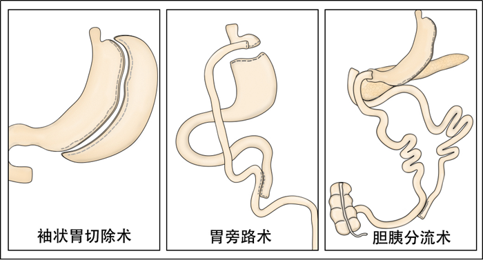 目前减重代谢外科被广泛接受的术式包括腹腔镜胃袖状切除术(laparoscopic sleeve gastrectomy,LSG)、腹腔镜Roux-en-Y 胃旁路术(laparoscopic Roux-en-Y gastric by-pass,LRYGB)、胆胰转流十二指肠转位(biliopancreatic diversion with duodenal switch,BPD/DS)。其中腹腔镜袖状胃切除术是目前国际上开展最为广泛的减重与代谢手术,比例超过50%,具有手术时间短、手术创伤小、并发症少、显著的减重降糖等优势。