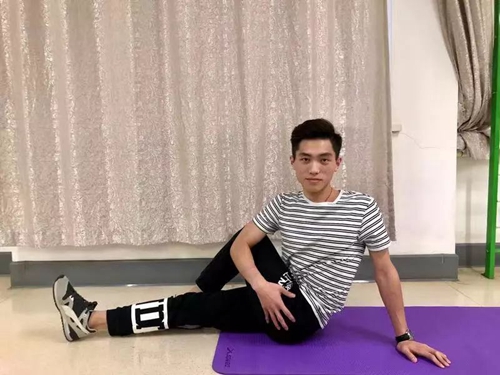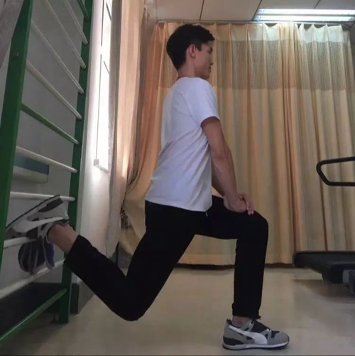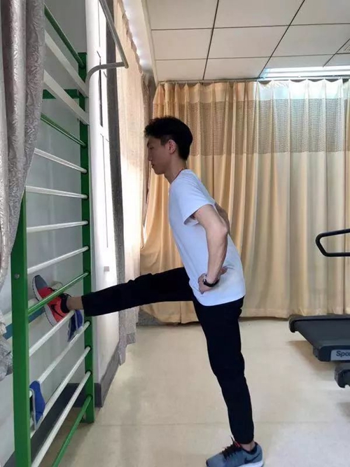 标准动作:体位为站立位,将一侧腿抬高,上体保持正直,身体前倾。