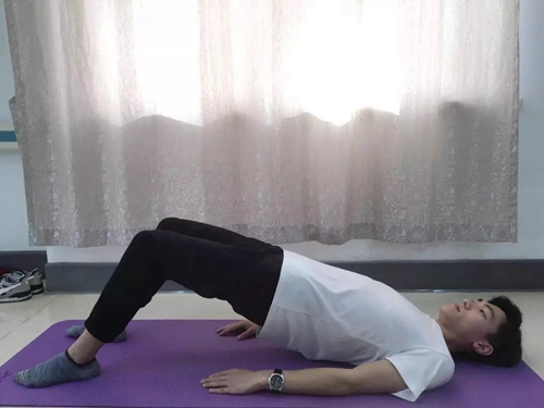 标准动作:仰卧位,屈膝(角度大于90度),双脚略大于髋,将臀部抬起,使足跟向臀部有相对滑动的趋势。
