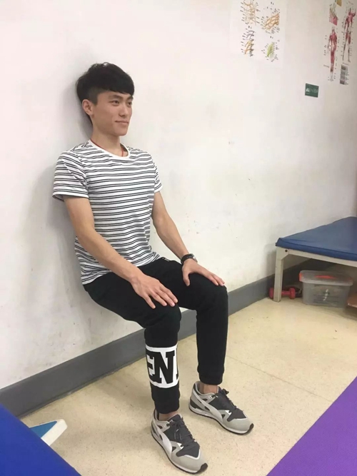 标准动作:背靠墙,双足与肩同宽,重心逐渐下移直到大腿与地面平行。