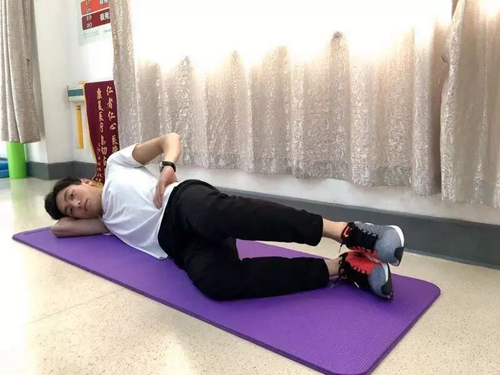 标准动作:体位为侧卧位,背、髋、足跟在一个平面内。将两个膝关节分开