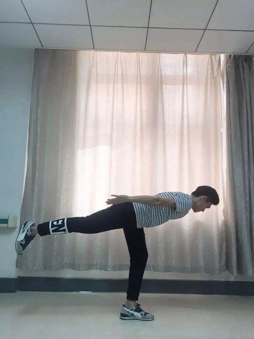标准动作:左腿站立,右腿后伸,身体前倾,尽量使身体与地面平行。两腿交替进行