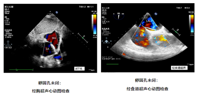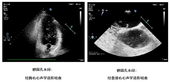 超声心动图是卵圆孔未闭的首选检查,包括经胸超声心动图及经食道超声心动图,都能够评价房间隔解剖结构和分流情况。经胸超声心动图扫查需要透过皮肤、皮下肌肉及脂肪组织对房间隔的分流进行评估,成人受各种因素如肥胖、肺气过多等影响,很难准确诊断及测量 PFO,检查结果可能为假阴性。而经食道超声心动图可清楚观察房间隔解剖结构,是诊断 PFO 的金标准。而超声心动图结合右心声学造影并配合规范的激发试验检查, PFO 的检出率可明显提高。
