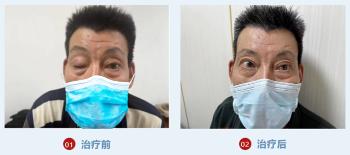 初来我院时,该患者右眼眼睑下垂、无法睁开,四肢无力、手指僵硬不能伸直,导致无法执筷和抓握大部分物品,这些症状给患者生活带来了巨大的困扰和不便。厉以忠医师临床经验丰富,详细了解病情后,便迅速为患者量身制定了针灸治疗方案。经过短短几个疗程治疗,患者病情迅速好转,眼睛可自如睁开,视力恢复如初,也能轻松抓握物品了。下图为患者治疗前后眼部肌肉对比情况: