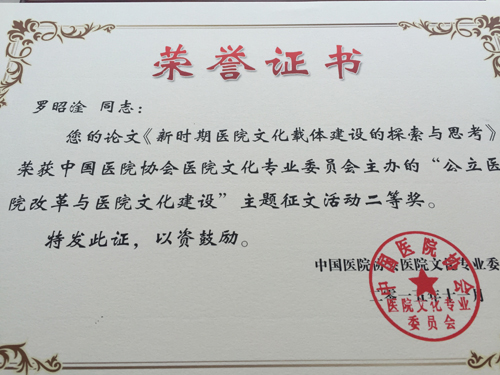 11月13日,中国医院协会医院文化专业委员会2015年学术年会暨医院文化建设高层论坛在浙江杭州召开。此次会议以展示、推广和提升医院文化建设先进经验和理论、实践能力为主旨,围绕公立医院改革和医院文化建设的热点问题开展了研讨交流。会上,医院被授予“全国医院文化建设先进单位”荣誉称号,杨婷同志荣获“全国医院文化建设先进工作者”称号,罗昭淦同志的论文《新时期医院文化载体建设的探索与思考》获主题征文活动二等奖。