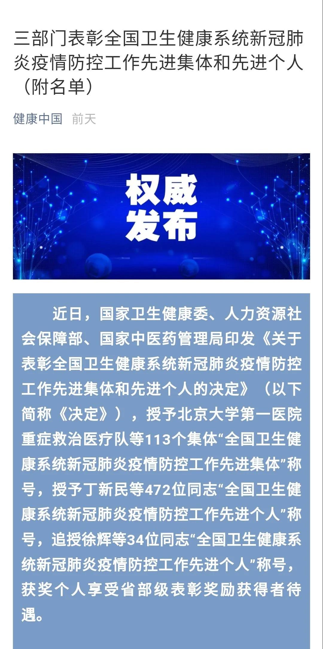张维新荣获"全国卫生健康系统新冠肺炎疫情防控工作先进个人"称号。