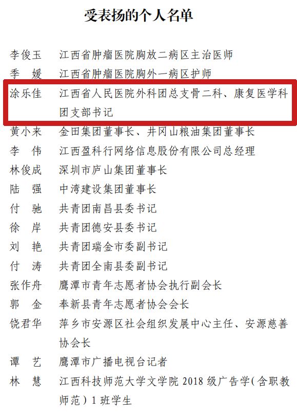 江西省人民医院国家(江西)紧急医学救援队青年突击队获“优秀青年集体”,外科团总支骨二科、康复医学科团支部书记涂乐佳获“优秀青年个人”荣誉称号。