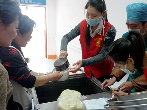 在准备饭菜时有大小不一的饭碗,营养师告诉志愿者们,这是根据病人食量进行的划分,小号的碗是一两饭、中号的是二两饭、大号的碗是三两饭,需要根据订菜单把饭准确送到病房。每个小组跟着一名营养师推着餐车来到病房,刚出电梯就已经有病人和家属在门口排着队等打饭,志愿者们马上成了病房里焦点。有的志愿者报菜单,有的志愿者进病房送饭菜,病人都连声说“谢谢你们,谢谢你们。”看到病人的笑脸,志愿者们干得越发自信。有些手脚利索的病人就端着碗提前出来打饭,满脸笑容,嘴里还说:“今天还有几位志愿者来帮忙呀,看你们做事还挺麻利的,真是谢谢你们,谢谢医院。”志愿者跟着营养师将菜添至病人碗里,又把饭用宽竹筷拨至碗里,半个小时左右,所有饭菜都派送到位了。