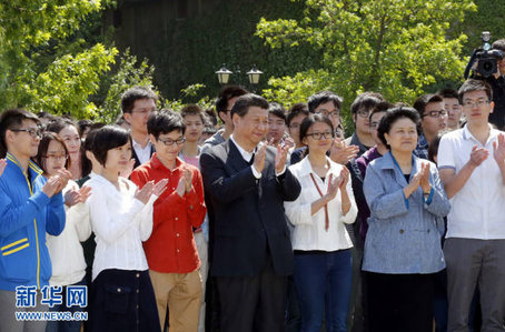 2014年5月4日,习近平在北京大学考察。这是习近平在校园观看北大师生纪念五四运动95周年青春诗会。