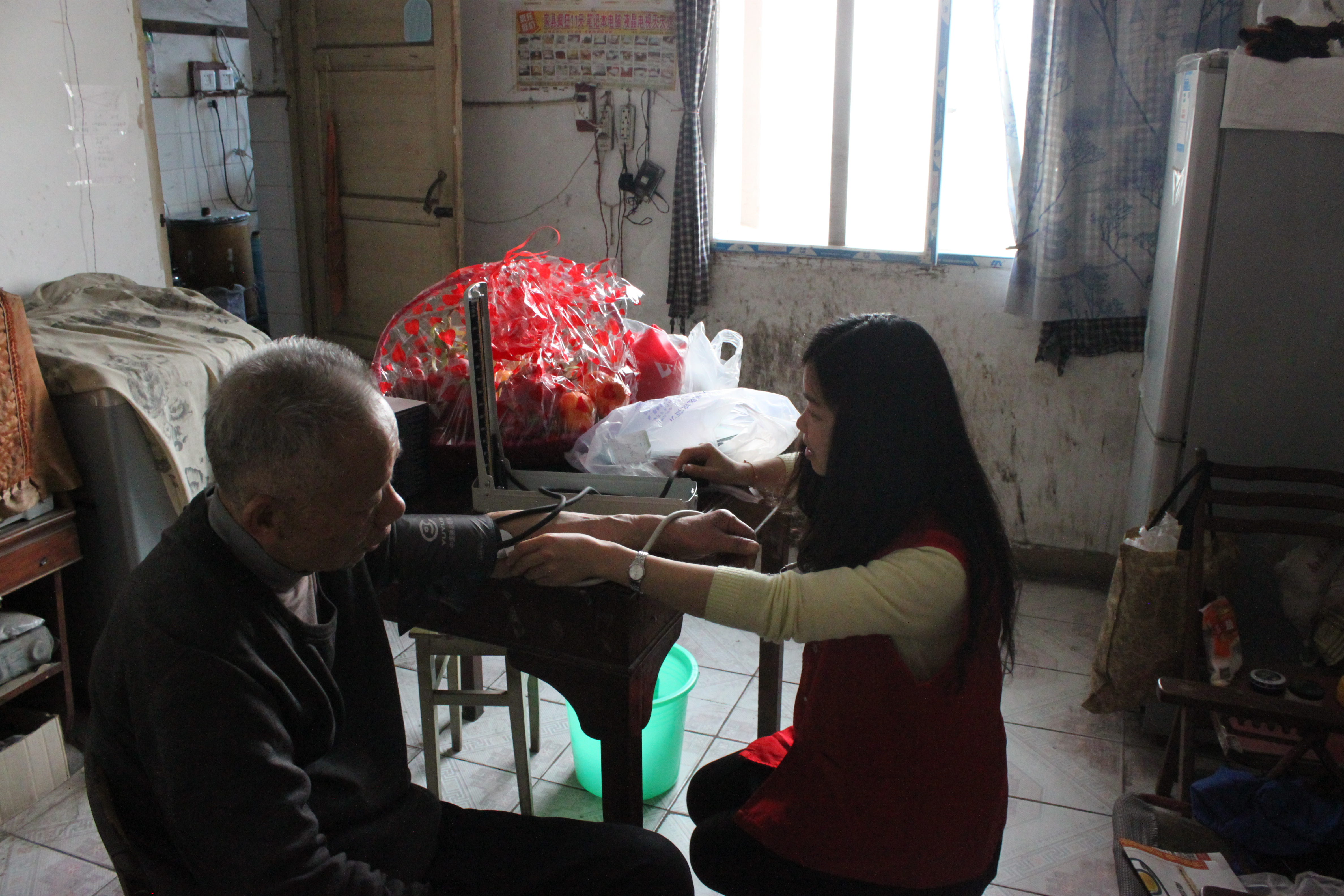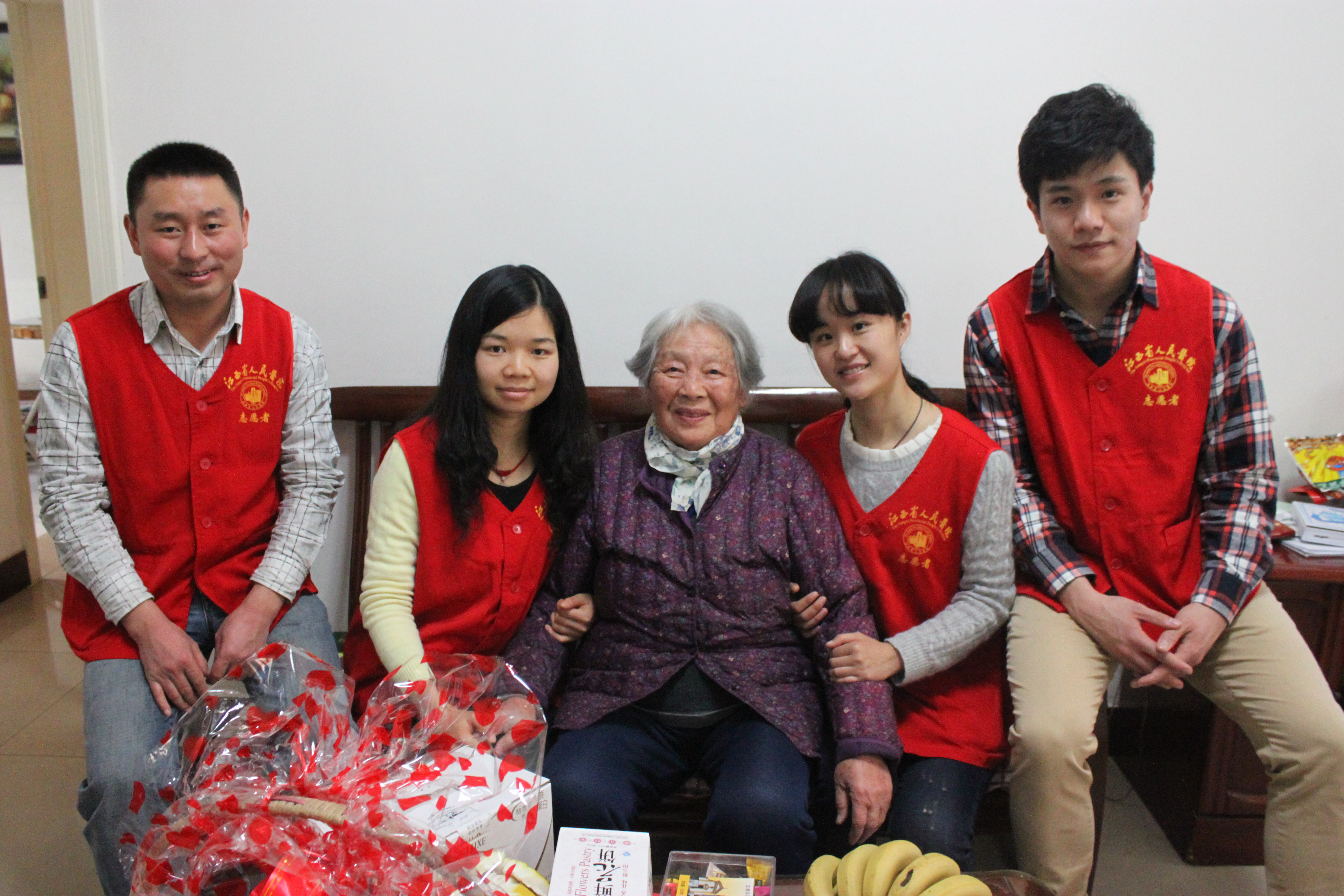 “红马甲”们先后来到86岁的林月英老人和81岁的朱水生老人家,为他们测量血压、发放健康宣传手册和送上水果和牛奶等慰问品。林月英老人对志愿者们的到来感到十分激动,开心地和大伙唠起家常。林老说道:“是共产党给予了我生命,把我养育长大,我永远都不会忘记党的恩情”。为了答谢大家,她还给大家唱起了“革命人永远是年轻”、“十送红军”等经典红歌。朱水生老人对志愿者的到来也甚是喜悦,他说道:“感谢你们来我家,我很高兴,你们都是向雷锋学习的好同志。”临别时,志愿者叮嘱老人们要注意身体并和老人合影留念。