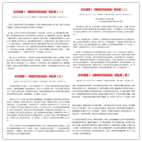 按照医院“不忘初心、牢记使命”主题教育的安排,7月9日起,每周二下午院党委组织党员干部职工集中观看江西卫视大型季播人文类节目《跨越时空的回信》。该节目一经播出,引起了全院党员干部职工的热烈反响。目前,该节目已经展播了六期,观看人次达600余人次,收到观后感30余篇。