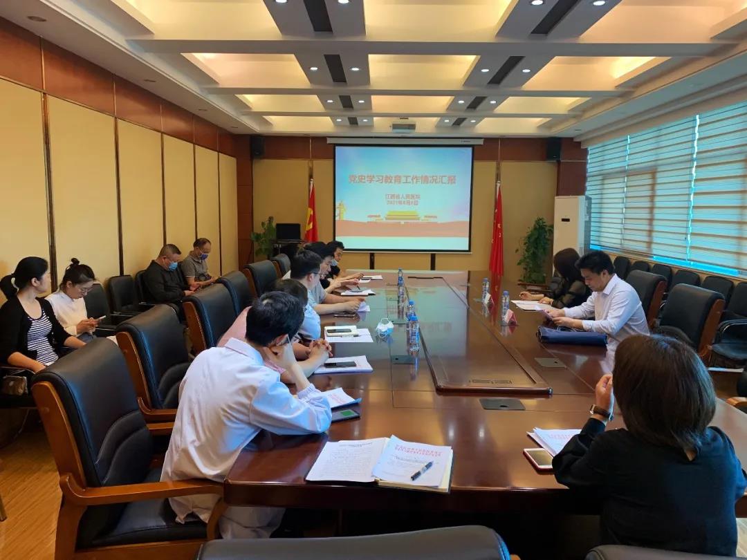 会上,黄清详细汇报了医院党史学习教育工作情况。一是精心部署组织,确保学习实效。医院成立党史学习教育领导小组,制定《江西省人民医院党史学习教育实施方案》,并及时召开全院动员部署大会,教育引导医院党员干部学好百年党史、传承红色基因、凝聚奋进力量,切实做到学史明理、学史增信、学史崇德、学史力行。二是创新学习形式,推动入脑入心 。党史学习教育开展以来,医院大力宣传,营造党史学习教育的浓厚氛围,在医院官网开设党史学习教育专栏,在党建平台微信公众号组织开展“党史天天读”活动,并通过医院电子屏、宣传栏、医院微信公众号等形式广泛宣传。组织广大党员和干部瞻仰参观革命遗址旧址、革命展览馆、纪念馆,举办“青春心向党 奋斗新征程”五四青年职工歌唱比赛等活动,自觉继承革命传统、传承红色基因、补足精神之钙。不断创新学习形式,组织领导干部开展“讲党史专题党课”、在全院党员中开展“百年党史微感言”主题征集活动、“学党史 知党恩 跟党走”党史知识竞赛、庆祝中国共产党成立100周年主题征文等活动。三是坚持知行合一,切实为民办事。进一步搭建起践行群众服务路线的窗口,把学习党史同总结经验、观照现实、推动工作结合起来,同解决实际问题结合起来,把学习成效转化为工作动力,围绕群众“急难愁盼”问题,积极开展“我为群众办实事”实践活动,制定活动实施方案,明确重点任务及重点事项清单,切实为群众办实事解难题,不断增强群众获得感、幸福感、安全感。