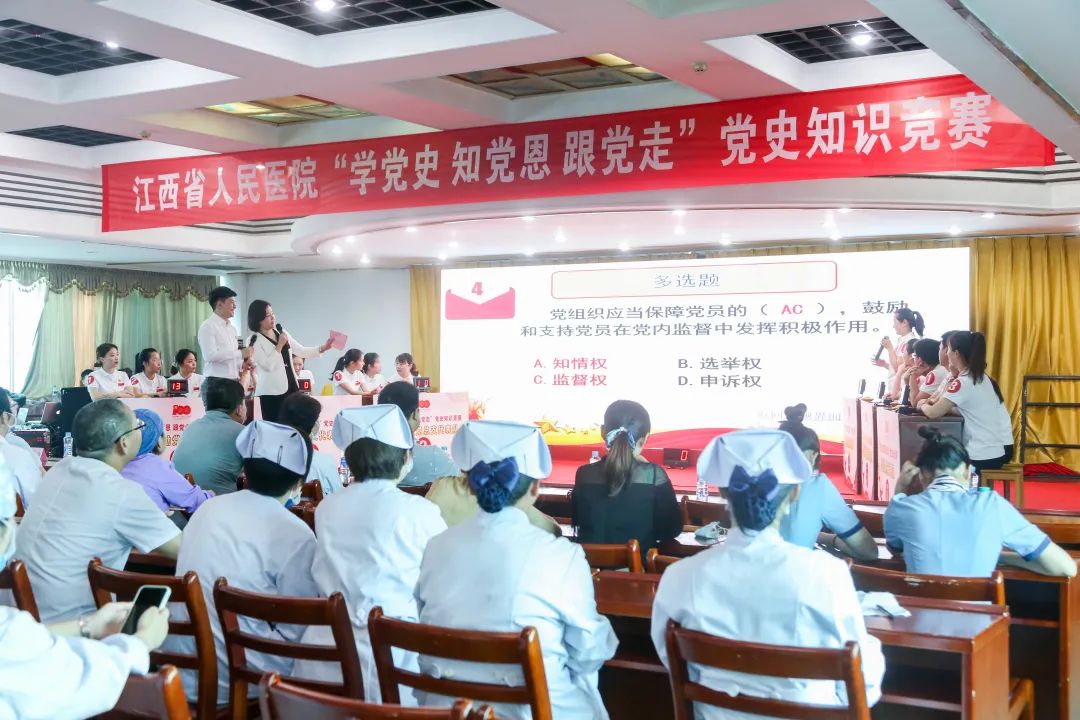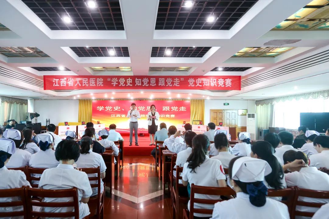 为庆祝中国共产党成立100周年,重温党的百年光辉历程,引导广大党员形成学党史、悟思想、办实事、开新局的浓厚氛围,5月26日下午,江西省人民医院在爱国路院区举办“学党史 知党恩 跟党走”党史知识竞赛,来自全院六支代表队参加比赛,在家院领导出席比赛现场,来自全院各党支党员代表、职工代表100余人到场观看。