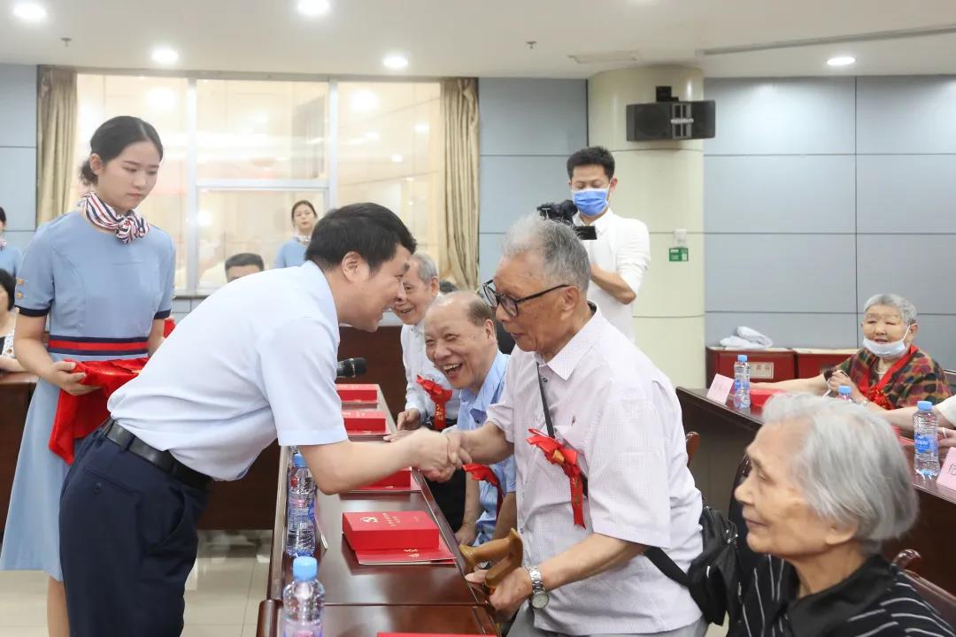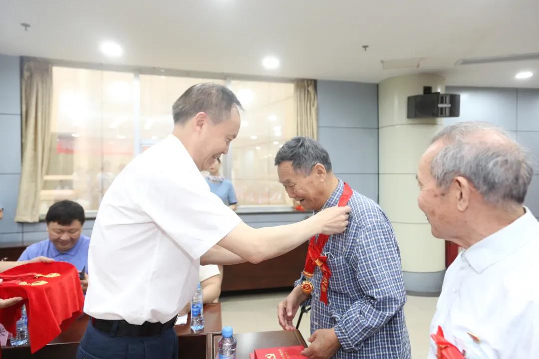 纪念章颁发仪式在庄严的国歌声中拉开帷幕。院领导班子成员先后走到座位旁,为在座的老党员们颁发“光荣在党50年”纪念章,并带上慰问和祝福。