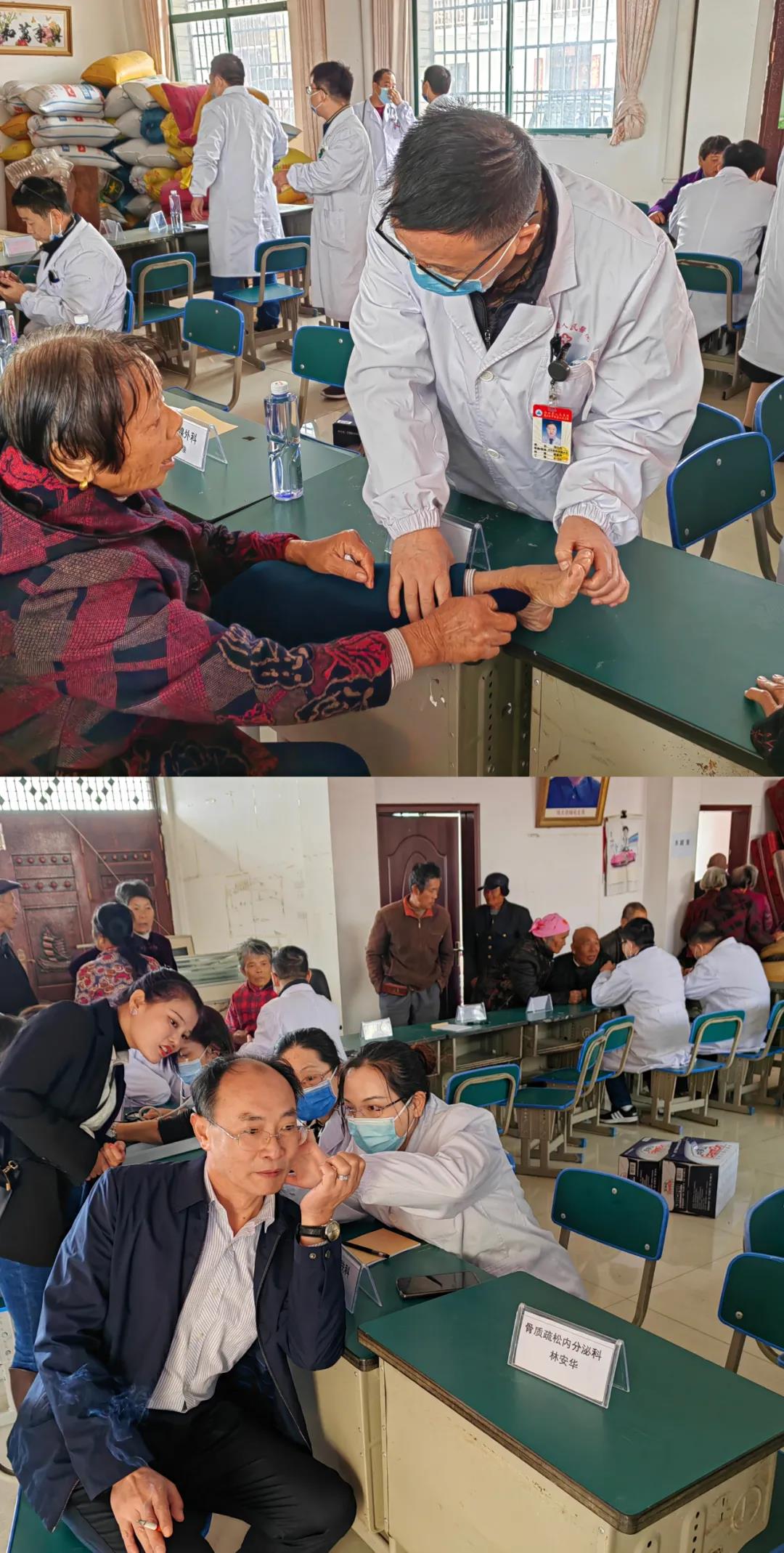 在联圩镇后洲村卫生室,党员医务专家发挥各自专业特长,与基层医务工作者进行现场交流,面对面讲,手把手教,帮助乡村医务人员提升诊疗水平。