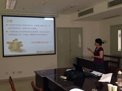 为了培养和锻炼血液净化专科护士的教学能力,提高专科护士队伍的综合素质,5月27日下午在北楼11楼肾内科办公室举办了首批血液净化专科护士小讲课汇演。15名专科护士每人限时十分钟,围绕血透患者健康宣教的主题,结合自己实际工作,以生动的语言、独到的见解、新颖的讲课方式以及精彩的幻灯播放给评委留下深刻印象。她们的讲课内容主题明确、重点突出、条理清晰、内容丰富,既包含卫计委推荐的透析器正确预冲方法的介绍、高通量透析等实用性较强的理论研究,也有关于血透护士礼仪、手卫生、干体重测量、血压正确监测等护理细节的深入探究,集中体现了当前我院提倡的血液净化优质护理的内涵提升,充分展现了血液净化专科培训班学员的风采及实力。