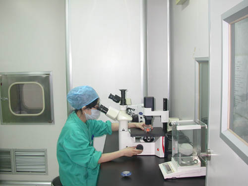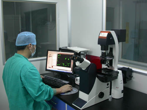 工作人员观察细胞生长情况