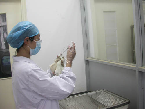 工作人员在实验动物中心进行动物实验