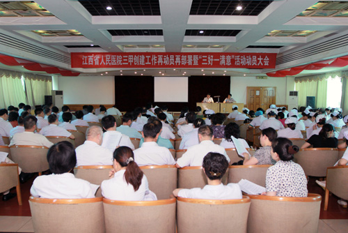 我院在2012年开展“标准建设年”活动基础上,为了进一步加强医院自身建设和规范化管理,确保我院顺利通过三级甲等综合医院评审,今年对三甲创建工作进行再动员再部署。霍亚南宣读了《江西省人民医院创建三级甲等综合医院工作方案》。活动共分为再动员再部署阶段,学习标准、任务分解、完善制度、自查摸底阶段,贯彻标准、建立示范科室、推广经验阶段,自查整改、持续改进阶段,查缺补漏、总结迎检5个阶段。