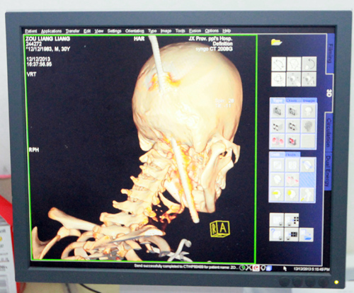 12月12日下午约3点半左右,我院急诊科收治由安义120送来的一位特殊外伤患者。据家属讲述,患者邹某,30岁,男,是一名司机,送货到某工地,下车后被高空坠落的一根螺纹钢筋扎中,从后脑插入,穿过小脑、颅颈交界部直至喉结部皮下,几乎贯通。此种急症伤极其罕见。
