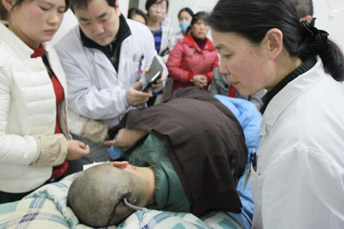 下午4点左右,我走进神经外科的病房,患者家属、责任方和患者工友们围在抢救室前,患者的母亲已经泣不成声,妻子悲痛万分,一根钢筋插入患者头部,触目惊心!神经外科三名护士面对这般惨状,依然尽心尽责地做好术前护理,同时不忘安抚家属,迅速做好了应急处理工作。