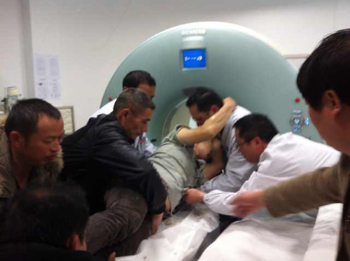 夜里7点半,双源CT开启绿色通道,技术人员守在现场,等待着患者的再次到来。神经外科主任万登峰抱着患者上了诊疗台,患者呈左侧卧状态,忍着病痛,右手死死的勾住万博士的颈部,本着高度负责的态度,万登峰艰难地摆好了特殊的检查体位,又照顾了病人的舒适程度,他一边安抚病人一边观察伤情,还不忘叮嘱检查注意事项,这一幕令人动容。