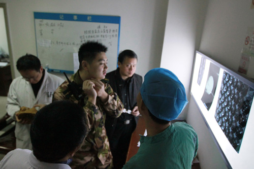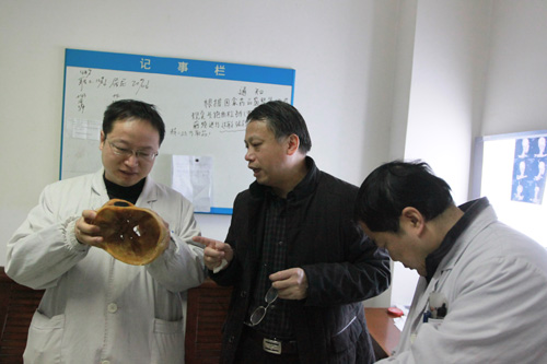在CT室过道,看见走路一瘸一拐的神经外科孙卫副主任医师,他正在和骨科专家袁中平商讨手术方案,走进CT室控制中心,里面已经汇集了神经外科、整形颌面外科、骨科、放射科、神经内科等许多专家。孙卫马上就投入到紧张激烈的术前讨论当中,完全忘记了自己的病痛,当天晚上他一直在手术台上进行手术,手术持续到次日凌晨4点左右,而他前一天摔伤导致踝骨骨折,第二天要靠支具行走。