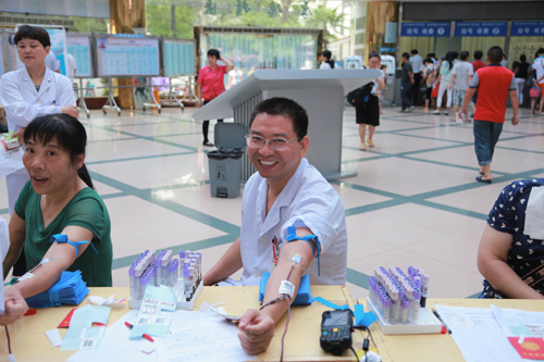 7月23日上午,医院组织职工院内献血。虽然天气炎热,但大家献爱心的热情不减,有117名职工献血,总献血量达35200ml。