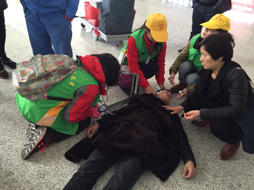 活动一开始,两家单位的志愿者们兵分两组,引导组由穿上绿马甲的两人小分组分散在南昌西站的人流密集处,细心引导旅客进站;宣传组的志愿者们身着白披肩,在候车室摆起来展台,为路过的旅客开展健康知识咨询、宣传和帮助。在24日的一整天里,引导组的志愿者们不顾寒风,站在南昌西站的入口处、车站站前广场等地,主动、热情地为旅客指引方向,以免不熟悉车站情况的旅客提着大包小包走弯路,为他们节约进站时间;在候车室里,志愿者们跟着章金媛主任为陆续前来候车的旅客提供健康咨询和宣讲,不厌其烦地教旅客们做保健操、六步洗手法,并进行心肺复苏现场教学。