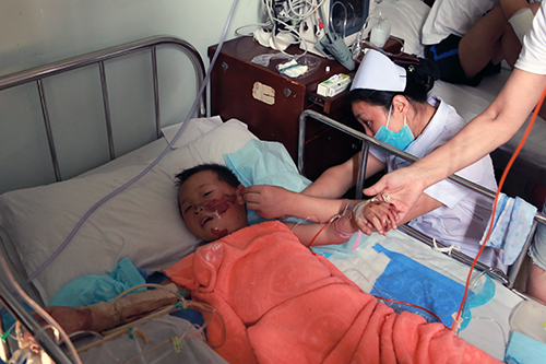 6月5日晚上9点,骨二科急诊收入了一名5岁的患儿,孩子的伤情令人揪心——右手臂犹如一截黑炭,发黑发臭,被大量泥沙覆盖,几乎看不见皮肤,手掌也变形肿胀。孩子脸上有巨大的挫伤,身上的大小伤口多达15处。