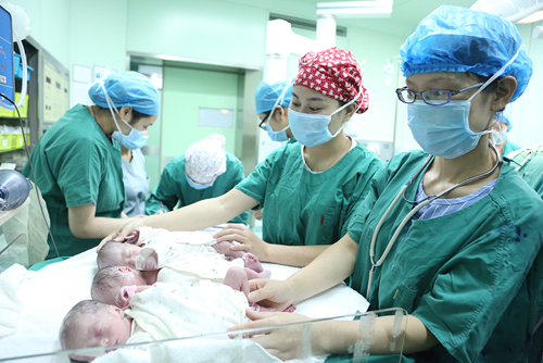 为孕妇主刀的是我院产科焦雅静主任。焦主任介绍说,近年随着促排卵药物和辅助生殖技术的应用,多胎妊娠发生率明显增高。然而按照妇产科学的一个统计公式,自然受孕三胞胎的几率约为70万分之一。而由于三胎妊娠孕妇并发症多,早产发生率及围生儿死亡率很高。所以这名孕妇坚持到34周+6天已经很不容易,因为到这个时候肚子已经特别大,几乎是睡不好也吃不好,非常辛苦。医生根据孕妇的身体情况,考虑到顺产风险很大,最终决定实施剖腹产术。