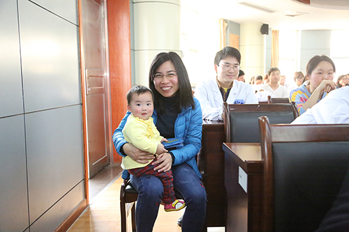 陈发秀表示,下班后有空就想多陪陪孩子,但是这个讲座对做课题很有帮助,很想听。今晨下夜班回到家,女儿很久没有看见妈妈,很粘人。这么小的宝宝离不开母亲的陪伴,又比较乖巧,陈发秀就试试带着她一起去学习。