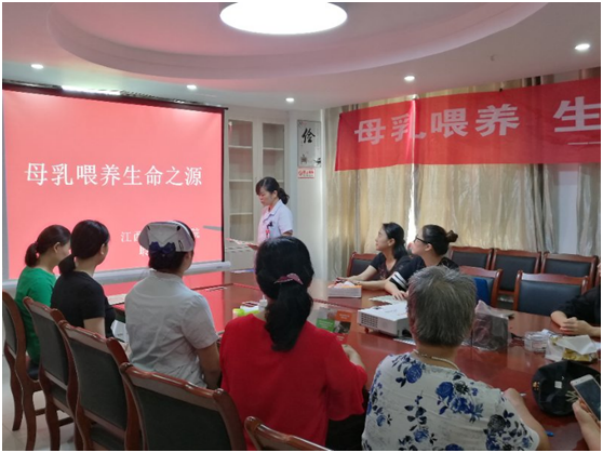 8月1日上午,妇产科罗文群主任医师带领护士长龚剑红,护士刘莎、李甜甜,护理志愿者万欢儿顶着炎炎烈日深入南昌市聆江花园社区开展国际母乳喂养周主题宣传活动。