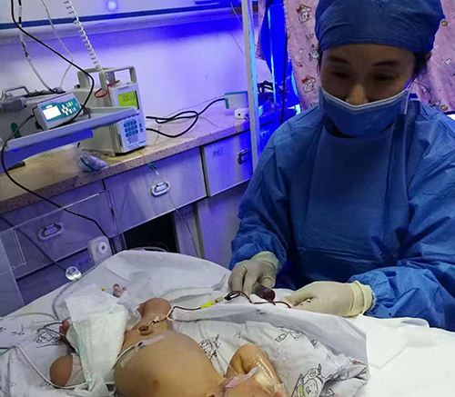 11月6日,儿科成功为一名出生仅一天半的溶血症患儿实施了经外周动静脉同步换血术。这项技术在儿科首次开展,标志着省医儿科新生儿重症抢救能力又上新台阶。患儿于11月12日顺利出院。