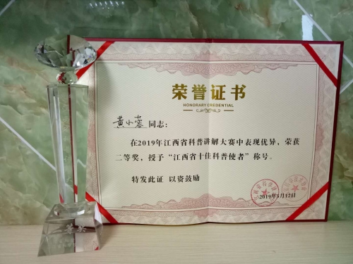 5月11-12日,经过半决赛、总决赛的连续拼搏,我院一部一区主管护师黄小蓉在2019年江西省科普讲解大赛上以94.1分的成绩夺得第8名,荣获全省科普讲解大赛二等奖,同时被授予“江西省十佳科普使者”称号。