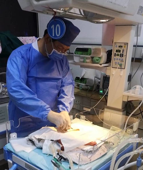 孙乐科立即启动“危重新生儿急救绿色通道”,他前往鄱阳县人民医院进行婴儿的转运,当晚7点,阳阳到达省医新生儿重症监护室。此时婴儿出生才2天,因严重肾功能衰竭,体重较出生时重了500g,并发全身浮肿、无尿、电解质严重紊乱、肺出血及凝血功能障碍等一系列问题,省医儿科医护人员揪紧了心,随即投入争分夺秒地抢救,救命的关键是恢复肾脏功能——开展腹膜透析,大家很快遇到难题,“治疗难”“穿刺难”“透析难”三大难关,稍有不慎,就可能危及孩子生命。儿科立即邀请心脏大血管外科、肾内科等多学科会诊,专家们建议立即行腹膜透析,经过反复协商,做好了充分的术前准备,在征得家长同意后,专家们准备开展新生儿“穿刺腹膜透析置管术”。心脏大血管外科主任高文根为患儿安置腹膜引流管并进行相关指导,石卫红副护士长紧急调派护士成立专护小组、调集腹透材料,最终顺利完成省医第一例新生儿腹膜透析,阳阳浮肿无尿的症状终于得到缓解。