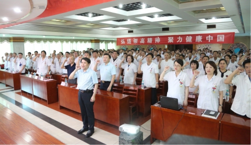 大会伊始,在党委书记、院长李秋根带领下,全体起立,庄重说出了《中国医师宣言》誓词:“我庄严宣誓,自觉维护医学的尊严和神圣,敬佑生命,平等仁爱……”,一句句铿锵有力的誓词响彻全场,激荡人心,催人奋进。