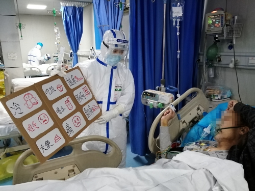 “您有什么需求,指一下‘菜谱’上面的图标告诉我就好!”2月24日晚7时许,武汉市第五医院的新冠肺炎重症患者熊先生指了一下自制图表中的“冷”和“喝水”,护士陈钰浠赶紧和同事给他重新盖好了被子、喂水。